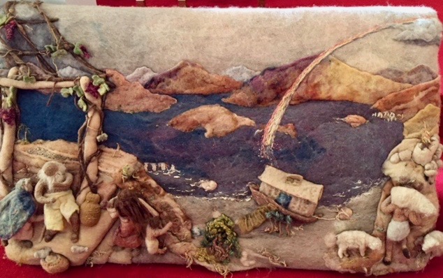 My work is made from hand-felted wool. I buy fleece, mohair, alpaca, silk, cotton and ramie from around the world, dye it and spin it whenever I need thread. Looking into the background you can see ancient cities emerging from the waves, Noah, the first vintner is seated as if enthroned in his arbor. Two of his sons work the land, seeding and plowing. The third son, on the right, is “ the good shepherd” a precursor of the images in the “New” Testament. We should remember that grapes and the making of wine were of great importance in the ancient world. There are countless myths and stories to remind us that wine is a potentially hazardous gift. For Noah himself it was a bounty which, taken in excess, became a tragic humiliation.