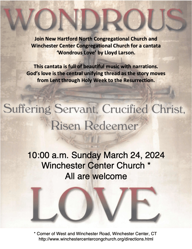 The New Hartford North Congregational Church and Winchester Center Congregational Church performed the cantata ‘Wondrous Love’ by Lloyd Larson. This cantata is full of beautiful music with narrations. God’s love is the central unifying thread as the story moves from Lent through Holy Week to the Resurrection.